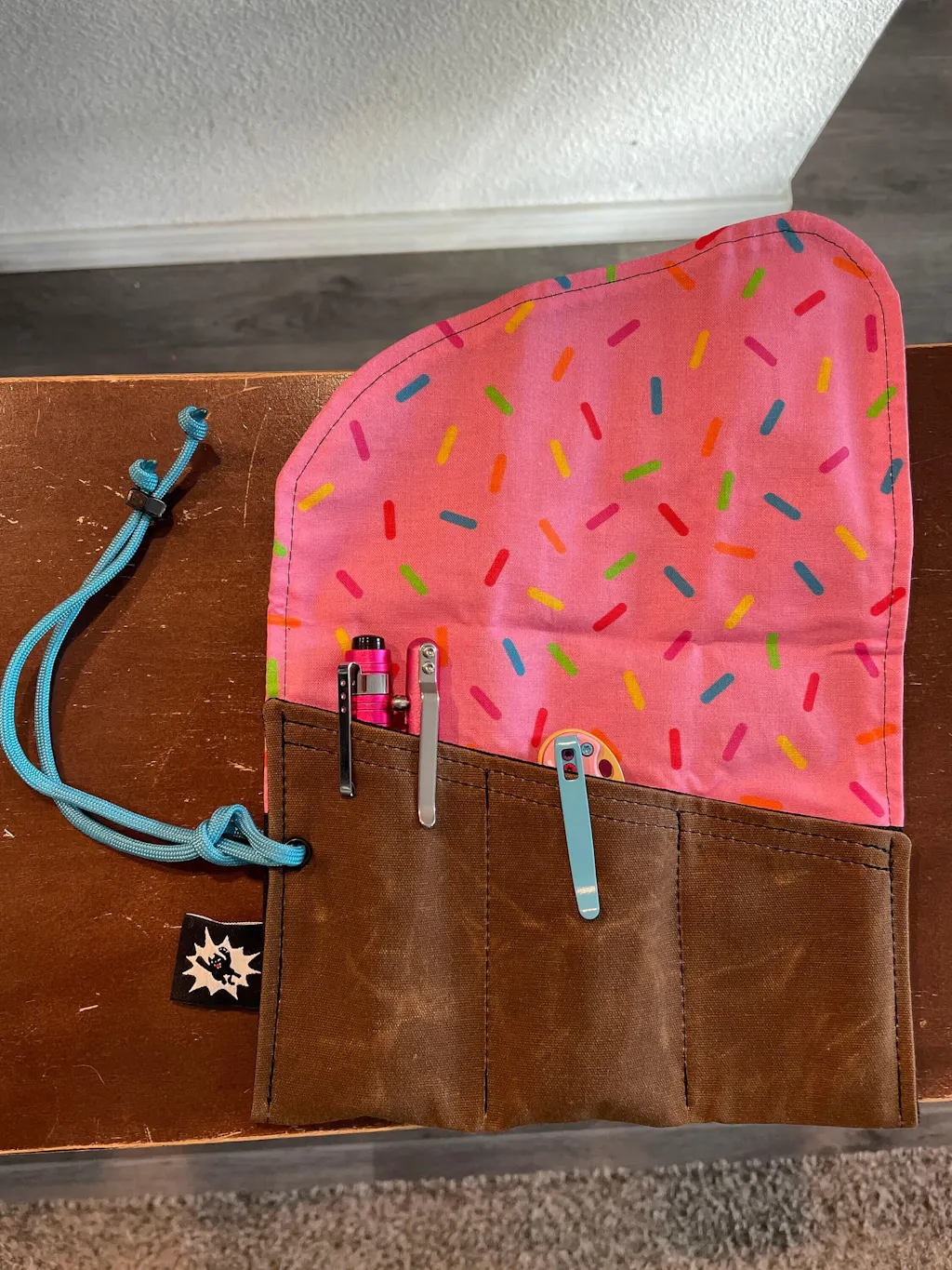 Waxed Canvas EDC Tool Roll. This is an Attack Cats original design. Nutmeg Brown Waxed Canvas is water resistant and has a nice heft to it. Inside you will find dessert warrior donut sprinkles, perfect for showing off your style. Imagine your collection splayed out on these rich, bright colors.